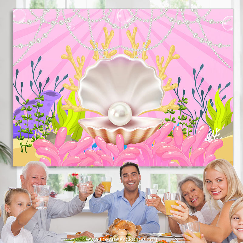 Cartoon Sea Pearl And Seaweed Birthday Party Backdrop