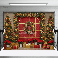 Lofaris Red and Gold Christmas Photography Backdrop, Elegant Arched Window with Garland, Holiday Photo Background