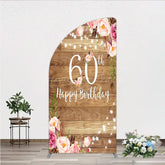 Lofaris Rustic Floral 60th Birthday Half Moon Arch Backdrop for Women, Pink Peony on Wood Background, String Lights Party Decor