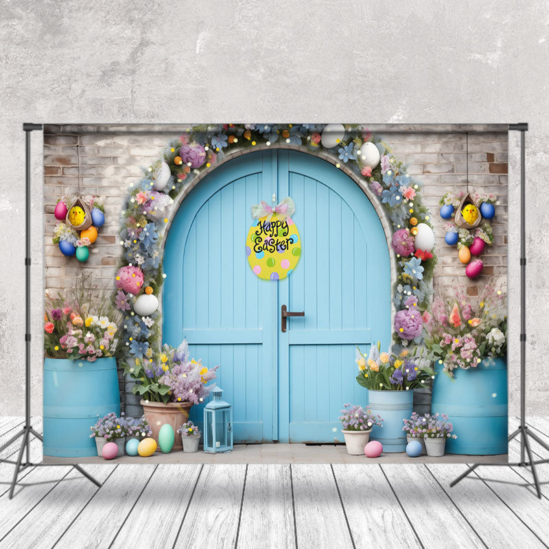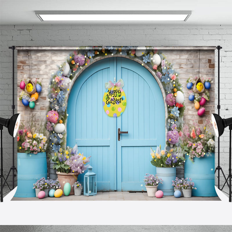 Blue Door Brick Wall Floral Happy Easter Backdrop
