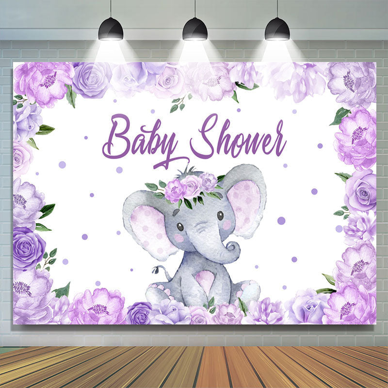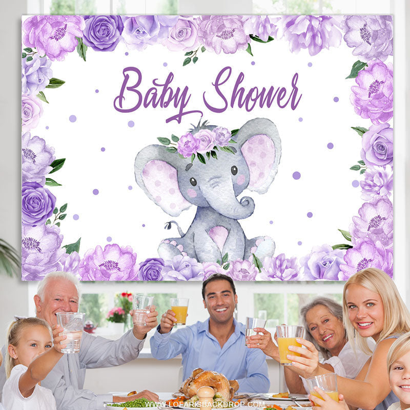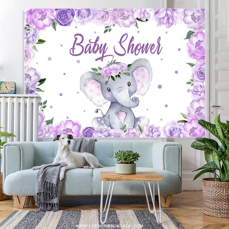 Purple Flowers Lovely Elephant Baby Shower Backdrop