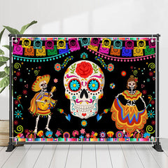 Colorful Floral Skull Black Mexican Fiesta Backdrop
