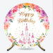 Lofaris Princess Castle Birthday Round Backdrop, Pink and Gold Floral Wreath Banner, Fairytale Themed Party Photo Prop