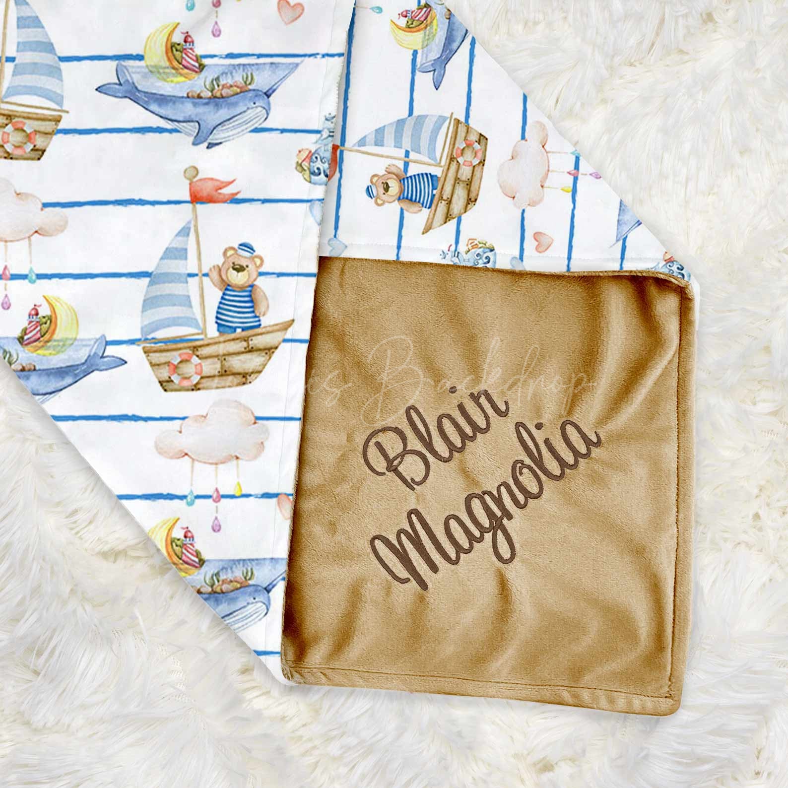 All of our blankets are custom made with different color options and include personalized embroidery. We embroider one side of the blanket before stitching the two layers together, ensuring that the back of the embroidery remains hidden and doesn't show on the other side. This unique technique distinguishes our blankets from many others, where the embroidery penetrates both layers! This will be the perfect baby shower gift, keepsake for a newborn baby, and an every day staple for your little ones comfort!