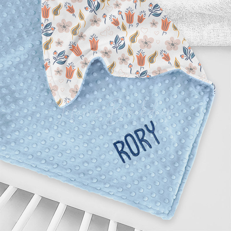 All of our blankets are custom made with different color options and include personalized embroidery. We embroider one side of the blanket before stitching the two layers together, ensuring that the back of the embroidery remains hidden and doesn't show on the other side. This unique technique distinguishes our blankets from many others, where the embroidery penetrates both layers! This will be the perfect baby shower gift, keepsake for a newborn baby, and an every day staple for your little ones comfort!