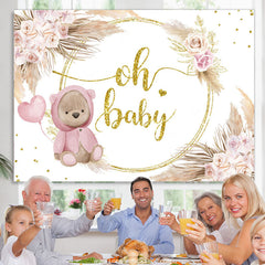 Pink Rose Gold Oh Baby Bear Floral Baby Shower Backdrop