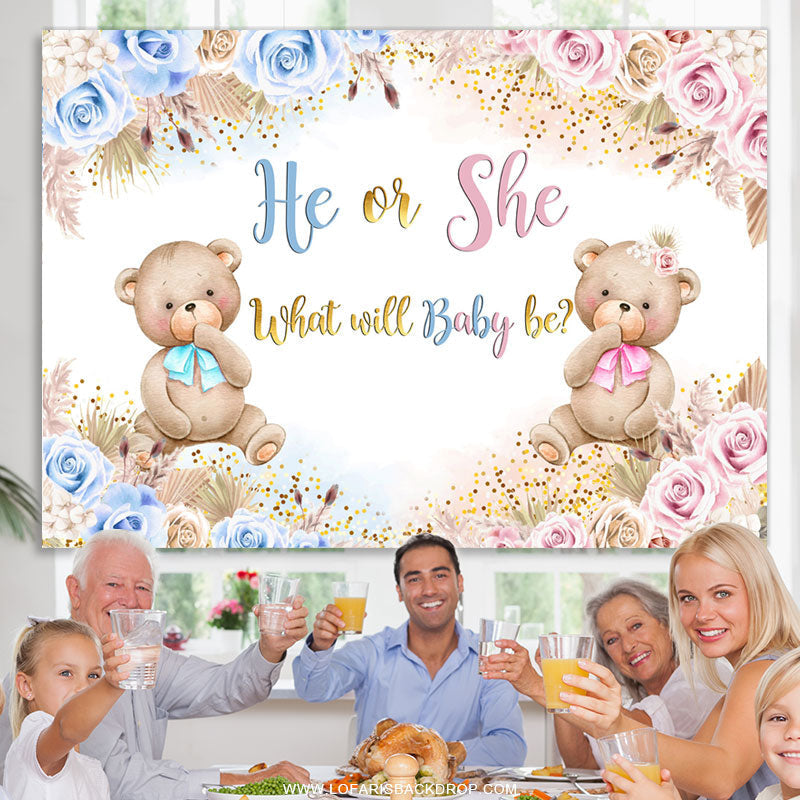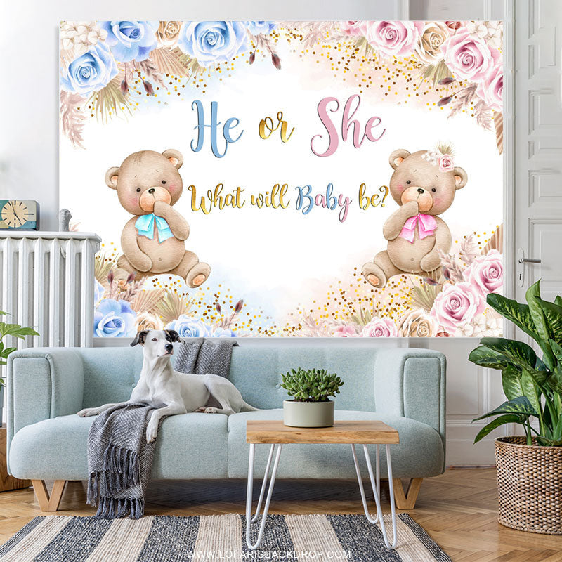 Blue And Pink Flower Teddy Bear Baby Shower Backdrop