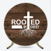 Lofaris Rooted in Christ Round Backdrop, Religious Cross with Roots on Rustic Wood Background, Christian Celebration Party Decor